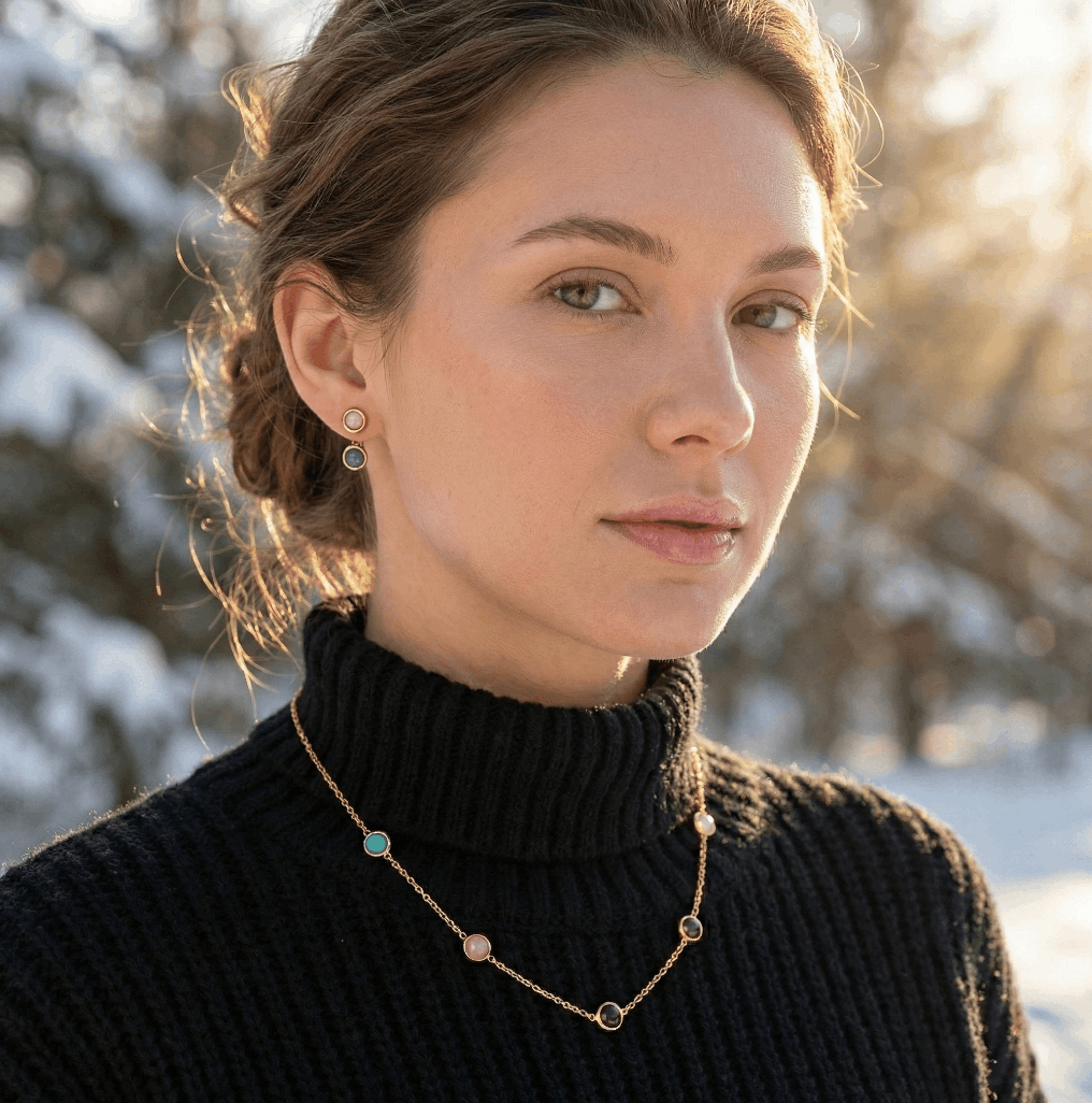 Die Celestial Harmony Stone Necklace vereint klassische Eleganz mit modernen Farbakzenten. Die fein eingearbeiteten runden Stein-Elemente verleihen der Kette eine besondere Ausstrahlung und sorgen für einen stilvollen, harmonischen Look.