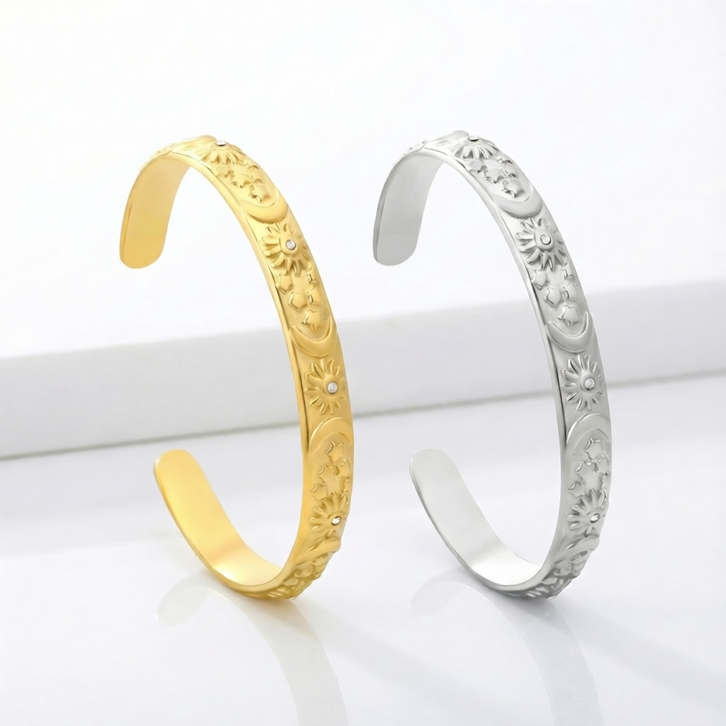 Das Elegant Celestial Cuff Bracelet vereint zeitlose Eleganz mit moderner Beständigkeit. Das Armband ist aus robustem Edelstahl gefertigt und mit einer 18K PVD-Beschichtung veredelt. Dadurch ist es wasserdicht, schweißresistent und besonders langlebig – ideal für den Alltag sowie besondere Anlässe.