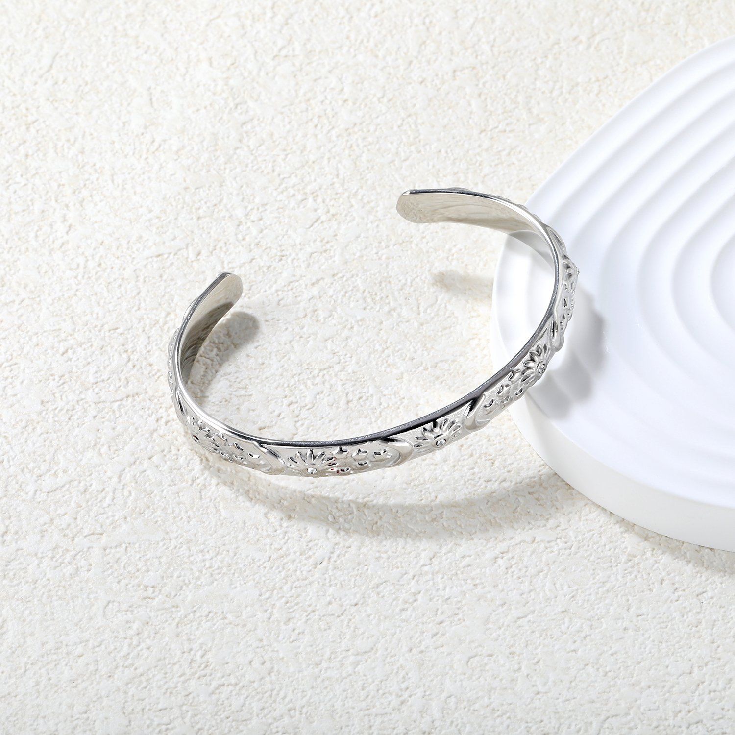 Das dezente Design mit Sonnen-, Mond- und Sternsymbolen verleiht dem Armband eine stilvolle, feminine Ausstrahlung. Die offene Cuff-Form ermöglicht eine flexible Anpassung an das Handgelenk und sorgt für hohen Tragekomfort.
