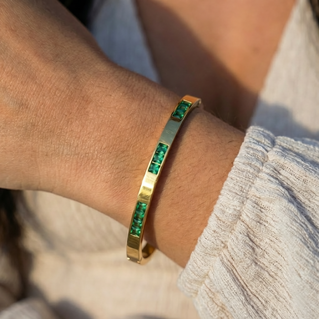 Das Emerald Gold Crystal Bracelet besticht durch seine klare Linienführung und die edlen grünen Kristalle, die dem Armband eine luxuriöse und zugleich moderne Ausstrahlung verleihen. Gefertigt aus robustem Edelstahl und veredelt mit einer langlebigen 18K PVD Goldplattierung, steht dieses Armband für Qualität, Stil und Alltagstauglichkeit.