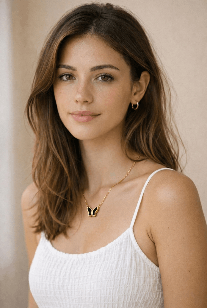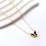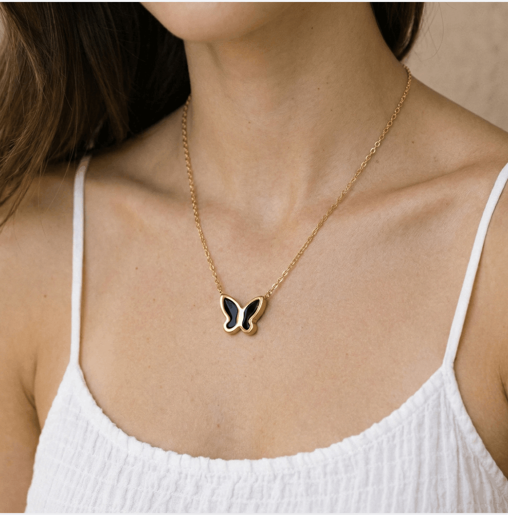Der dekorative Schmetterlings-Anhänger (12,5 x 9,8 mm) mit schwarzem Detail setzt einen eleganten Kontrast zum goldenen Rahmen. Das Design symbolisiert Leichtigkeit und Eleganz und eignet sich perfekt für den Alltag oder besondere Anlässe.