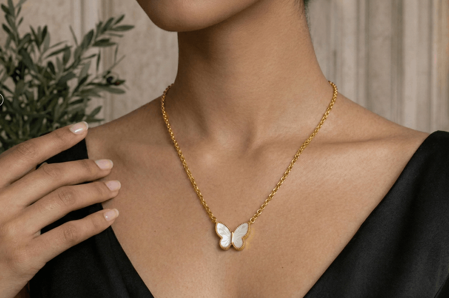Der Schmetterlings-Anhänger (11 x 9,3 mm) mit hellem Perlmutt-Detail verleiht dem Schmuckstück eine feminine und harmonische Ausstrahlung. Die Kombination aus Gold und heller Einlage sorgt für einen modernen und zugleich zeitlosen Look.