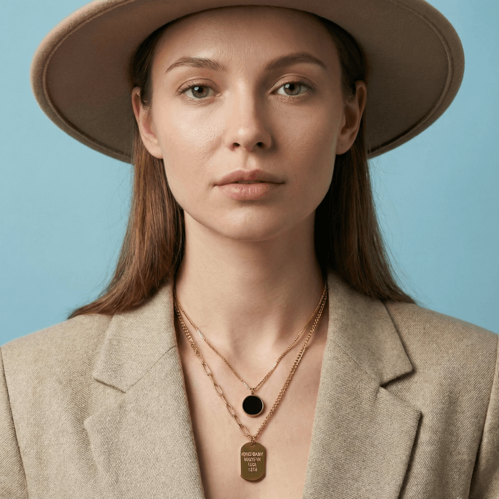 Diese hochwertige, mehrlagige Halskette überzeugt durch ihr modernes und ausdrucksstarkes Design. Gefertigt aus robustem Edelstahl (Stainless Steel) und veredelt mit einer langlebigen 18K PVD Goldbeschichtung, bietet dieses Schmuckstück eine besonders hohe Qualität.