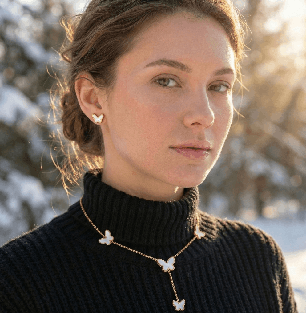 Die Ivory Butterfly Elegance Necklace verkörpert feminine Leichtigkeit und stilvolle Raffinesse. Die weißen Schmetterlings-Elemente verleihen dem Schmuckstück eine sanfte, elegante Ausstrahlung und machen es zu einem besonderen Blickfang.