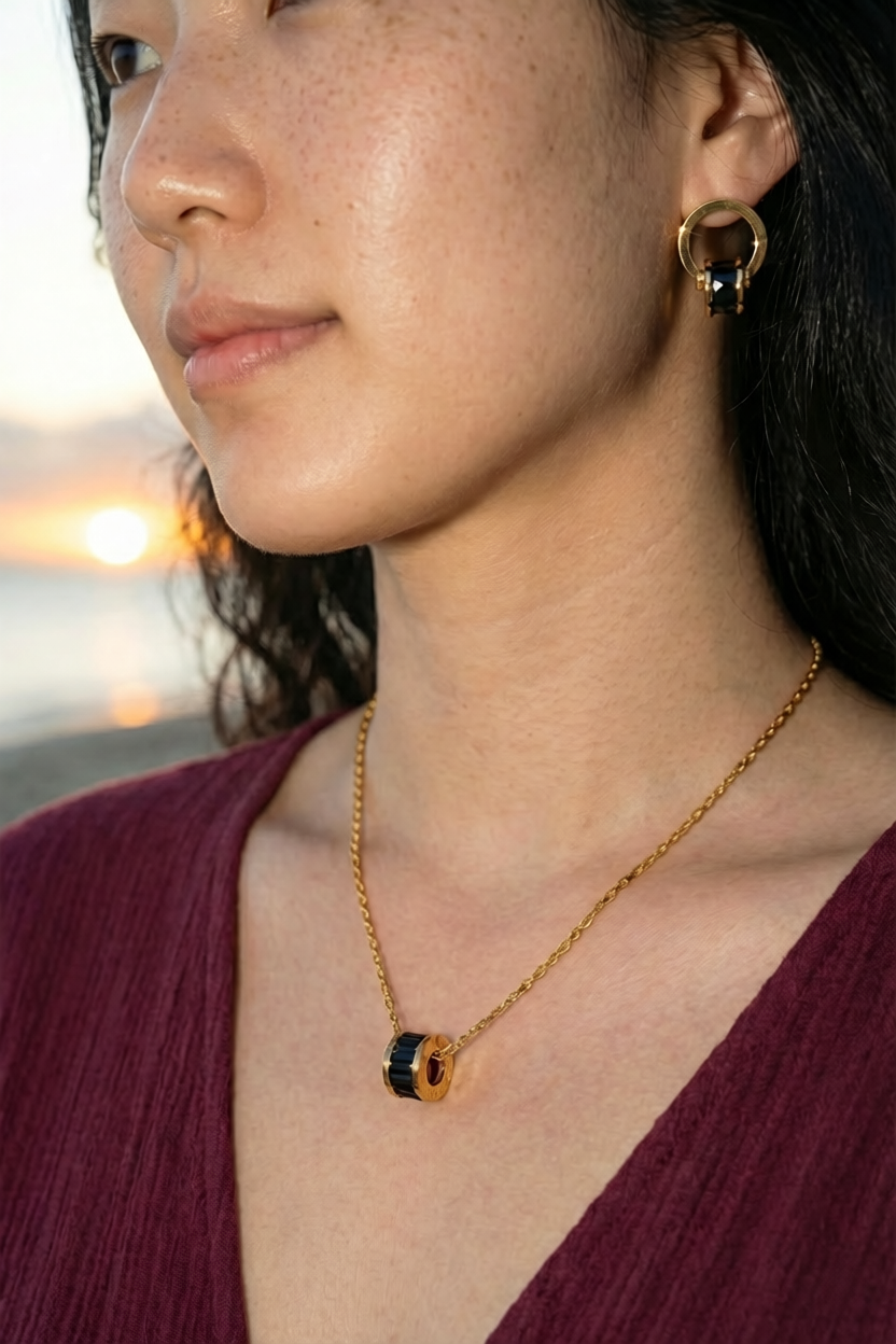 Das Schmuckset besteht aus hochwertigem Edelstahl und ist mit einer langlebigen 18K PVD-Goldbeschichtung veredelt. Die verwendeten Zirkonia-Steine verleihen dem Set eine edle Tiefe. Dank der robusten Verarbeitung ist das Set wasserfest und schweißresistent und eignet sich ideal für den Alltag sowie für besondere Anlässe.