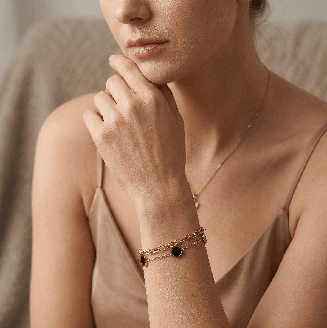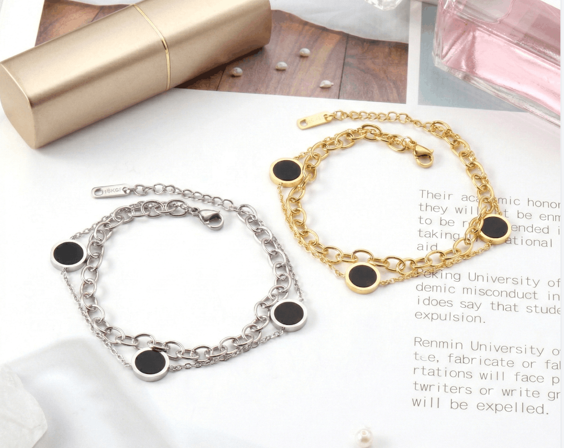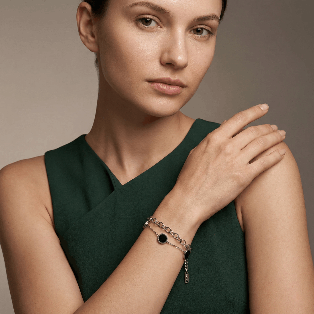 Das Modern Double Circle Bracelet überzeugt durch sein modernes, elegantes Design mit doppelter Kettenführung. Die Kombination aus grober Gliederkette und feiner Kette mit runden Elementen verleiht dem Armband einen stilvollen und zeitlosen Look.