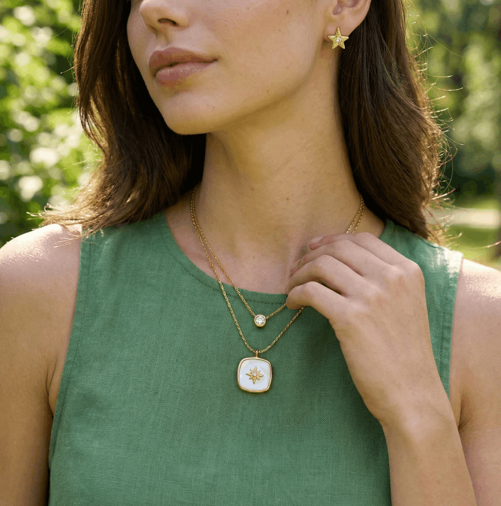 Die Radiant Double Layer Necklace steht für klassische Eleganz mit modernem Akzent. Das stilvolle Layer-Design kombiniert eine feine Kette mit funkelndem 5 mm Zirkonia und einen quadratischen Anhänger mit zartem Stern-Detail in der Mitte.