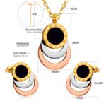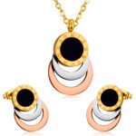 Das Roman Circle Jewelry Set überzeugt durch ein modernes, zugleich zeitloses Design. Der Anhänger kombiniert mehrere ineinanderliegende Kreise in Gold-, Silber- und Roséoptik, ergänzt durch einen schwarzen Mittelkreis mit römischen Ziffern. Die passenden Ohrringe greifen dieses Design harmonisch auf und sorgen für einen stilvollen Gesamtlook.
