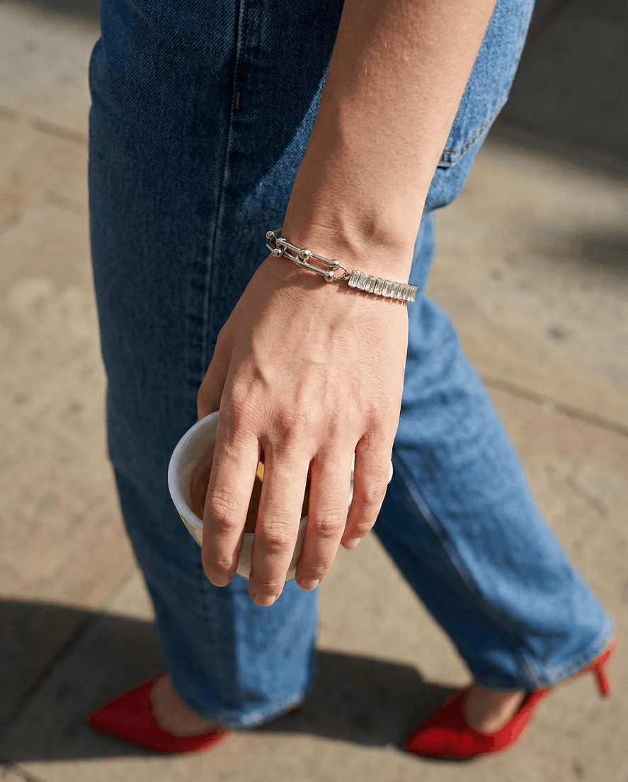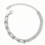 Das Silver Crystal Chain Bracelet kombiniert modernes Kettendesign mit eleganter Ausstrahlung. Die markanten Glieder-Elemente auf der einen Seite und die funkelnden rechteckigen Kristalle auf der anderen Seite verleihen diesem Armband einen besonderen, stilvollen Charakter.