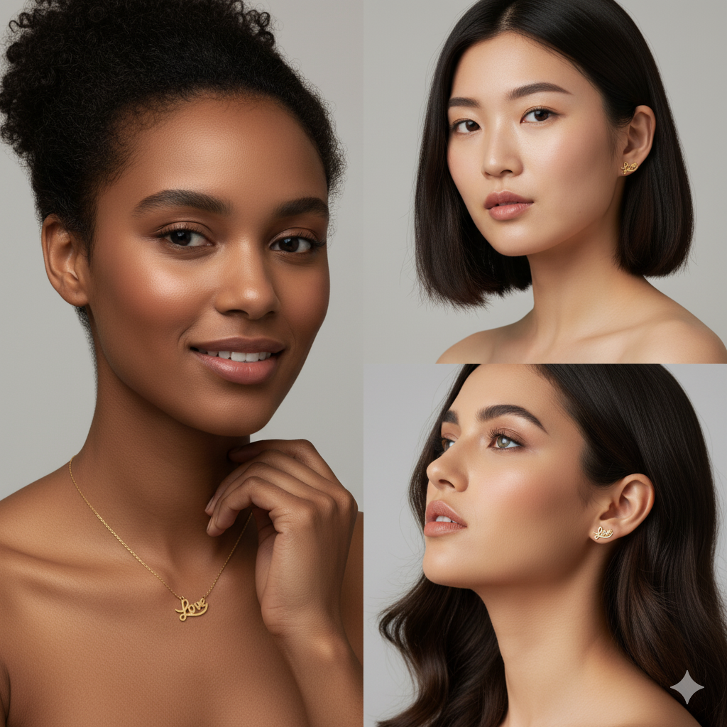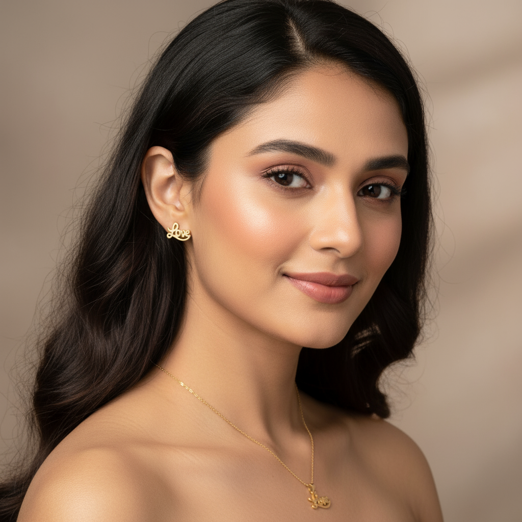 Das Arka Love Schmuckset vereint eine elegante Halskette und passende Ohrstecker, beide verziert mit dem fein geschwungenen Schriftzug Love. Ein Design, das Romantik, Stärke und pure Weiblichkeit in einem einzigen Wort einfängt.